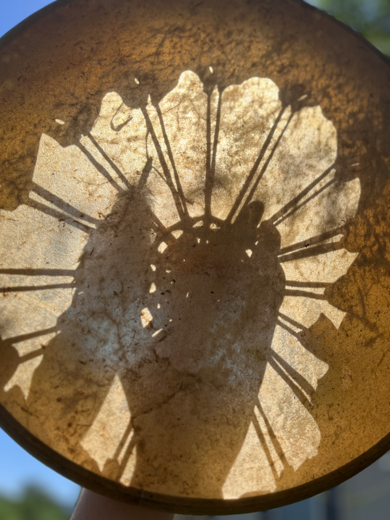 The hide is soaked in water and stretched around a maple wood hoop, then left to dry and finally oiled for a drum naturally tuned to a unique frequency.
